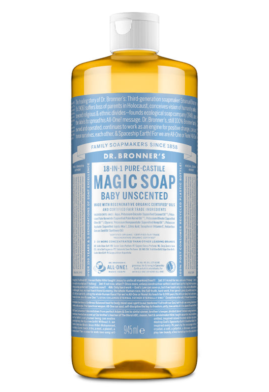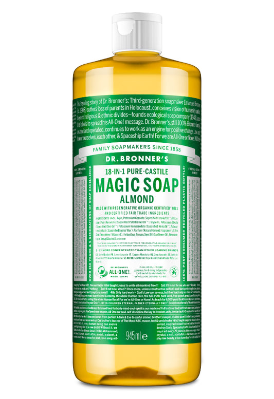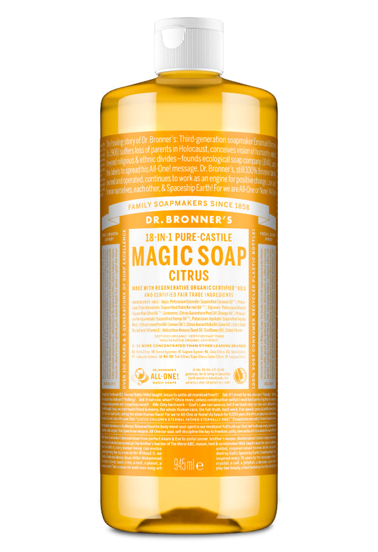 Dr. Bronner’s 18-in-1 Pure-Castile Soaps are multi-surface all-purpose cleaners good for just about any task. Wash face, body, hair, hands! Clean toilets, bathtubs, countertops, dishes—great for laundry, mopping, pets, and aromatherapy—with no synthetic preservatives, detergents or foaming agents—none! Dilute! Dilute! OK!! For detailed product uses, read Lisa Bronner's Liquid Soaps Dilutions Cheat Sheet