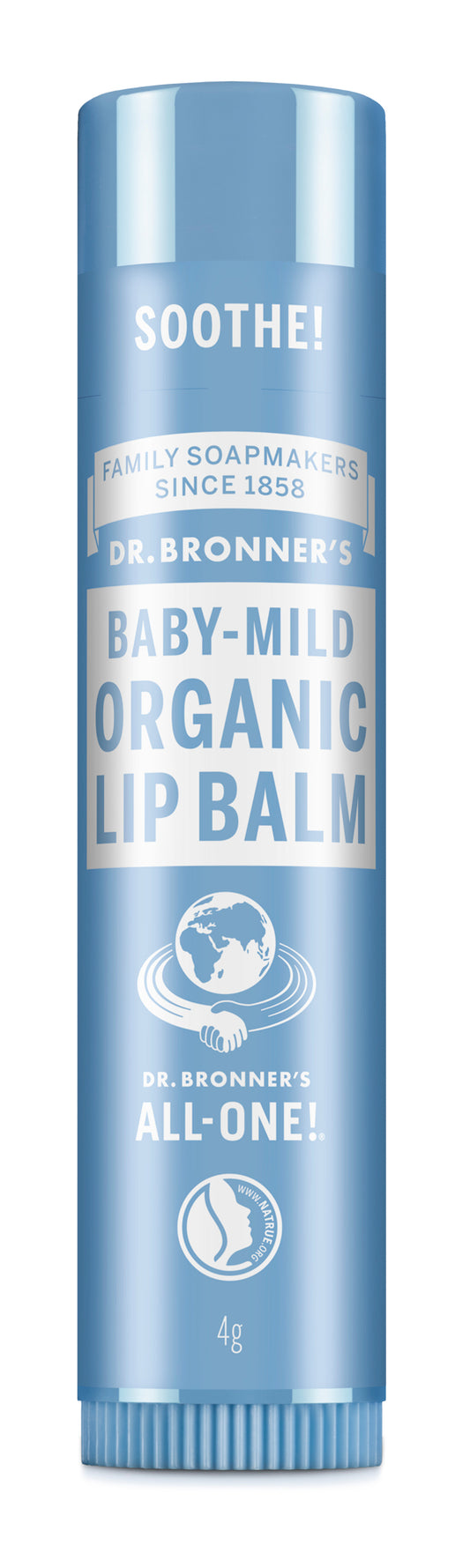 Dr. Bronner's Organic Lip Balms, made with organic beeswax, provide a protective barrier to the elements with no synthetic ingredients! None! Organic jojoba, avocado and hemp oils help with extra moisturization. Only the finest essential oils are used for fragrance. Certified organic to USDA National Organic Program standards, because what you put on your lips goes into your body. Vegetarian.
